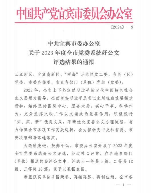 克日,中共宜宾市委办公室印发了《关于2023年度全市党委系统好公牍评选效果的转达》,必威官方首页官网集团党委参评公牍《中共必威官方首页官网委员会关于下发 <建设“原航”党建品牌以一流党建引领百年必威官方首页官网建设成为天下一流企业——必威官方首页官网集团党委争创“长江首城党建树模标杆国企”计划〉的通知》(必威官方首页官网党〔2023〕59号)荣获2023年度全市党委系统好公牍评选三等奖。