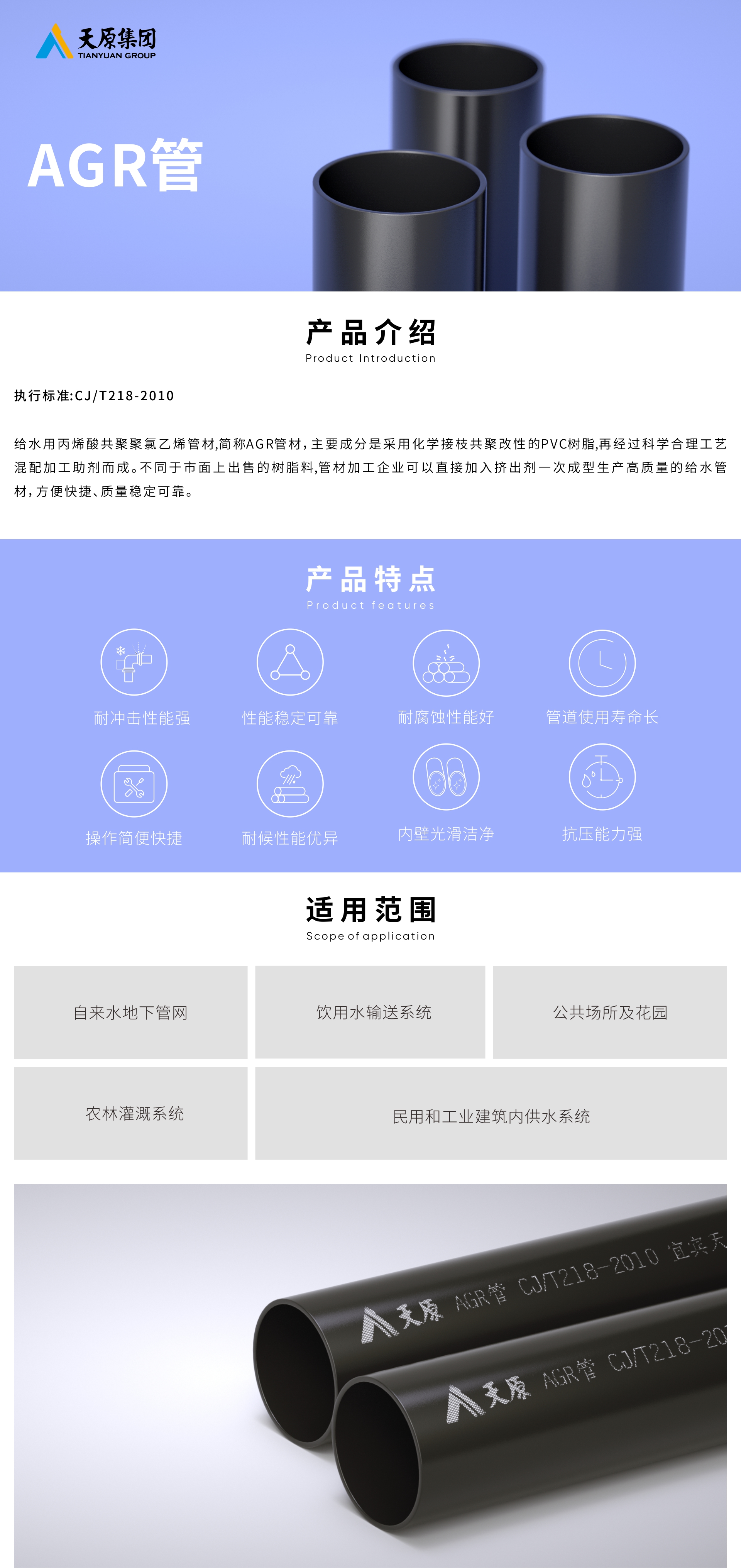 给水用丙烯酸共聚聚氯乙烯管材,简称AGR管材,主要因素是接纳化学接枝共聚改性的PVC树脂,再经由科学合理工艺混配加工助剂而成。差别于市面上出售的树脂料,管材加工企业可以直接加入挤出剂一次成型生产高质量的给水管材,利便快捷、质量稳固可靠。
